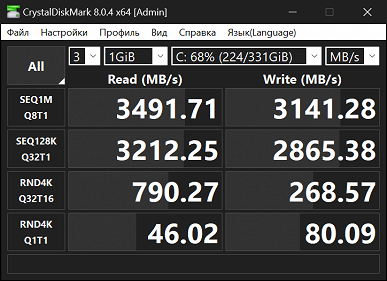 Но со скоростью записи и копирования дела не настолько плохи, хотя Core и Ryzen всё равно куда быстрее китайского Zhaoxin. По сравнению с Ryzen процессор KaiXian KX-7000 медленнее в этих операциях до 2-2,5 раз, и лишь половину разницы можно списать на преимущество в частоте DDR5-памяти. Если сравнивать KX-7000 с 11600K, использующим примерно такую же DDR4-3200 память, процессор Intel оказался быстрее на треть при записи, и более чем на 80% при копировании данных. А ведь у современных западных CPU есть возможность использования еще более быстрой памяти, вплоть до DDR5-8800 — особенно для Intel, так что отставание китайцев на деле еще больше.
