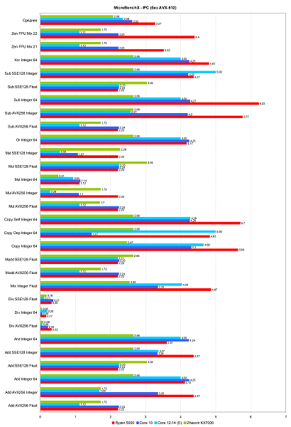 Мы проверили все указанные ядра в еще одном тесте MicroBenchX, который для корректных измерений требует работы CPU на постоянной частоте — мы зафиксировали работу всех ядер тестовых процессоров AMD и Intel на уровне 4 ГГц — на подобную частоту способны все представленные модели. А KX-7000 просто всегда работал на 3,6 ГГц, так как тест использовал одной из пары быстрых ядер, а технологий повышения частоты у Zhaoxin нет. Так как китайский процессор не поддерживает набор инструкций AVX-512, то рассматриваем только тесты без этих инструкций.