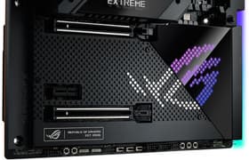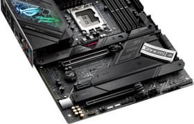 Материнская плата Asus ROG Maximus Z690 Extreme — самый навороченный и дорогой представитель топовой серии ROG для нового поколения процессоров Intel с примерной стоимостью в районе 100 тысяч рублей. Эта тяжеленная огромная плата просто напичкана контроллерами и портами, у нее 20 портов USB, включая 10 USB 3.2 Gen2 (2 Thunderbolt 4) и 2 USB 3.2 Gen2×2, 2 слота PCIe 5.0 х16, 5 слотов M.2 (один подключен к процессору линиями PCIe 5.0), в том числе 2 на адаптере DIMM.2, 6 портов SATA и 8 разъемов для вентиляторов. Есть два быстрых проводных контроллера 2,5 и 10 Гбит/с и один самый современный беспроводной. Комплект поставки богатейший: раздвижная подставка под тяжелые видеокарты, внешний игровой ЦАП ROG Clavis, DIMM.2, Fan Controller и т. д.