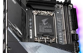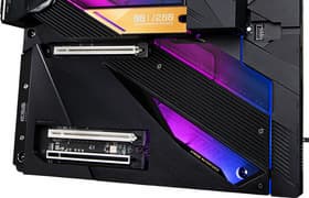 Материнская плата Gigabyte Z690 Aorus Xtreme Waterforce — самый что ни на есть топовый представитель серии Aorus с соответствующей стоимостью. Она предлагает 21 USB-порт, включая 12 USB 3.2 Gen2, в том числе два Thunderbolt 4, а также один USB 3.2 Gen2×2. Также здесь 3 слота PCIe х16. Для накопителей имеются 4 слота M.2 и 4 порта SATA. Эта модель снабжена 10 разъемами для вентиляторов, а также огромным водоблоком, подключаемым к кастомной СВО, при этом водоблок накрывает собой каждый потенциально греющийся элемент, включая CPU VRM, накопители в слотах M.2 и скоростной сетевой контроллер Marvel. Кстати, сетевые возможности у платы прекрасные: два быстрых проводных контроллера 10 и 2,5 Гбит/с, а также один самый современный беспроводной. Поддержка Thunderbolt 4 позволяет передавать данные на скорости 40 Гбит/с. Отметим и уникальную аудиоподсистему.