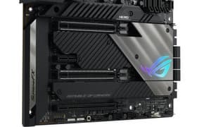 Asus ROG Maximus XIII Hero — представитель топовой серии ROG, но сравнительно компромиссный, со стоимостью в районе 40 тысяч рублей. Это весьма навороченная материнская плата с поддержкой 11-го поколения процессоров Intel, созданная для хардкорных геймеров и энтузиастов-оверклокеров. У нее 19 портов USB разных видов, включая 8 очень быстрых USB 3.2 Gen2, из которых два поддерживают Thunderbolt 4, а также один самый быстрый USB 3.2 Gen2×2, правда в виде внутреннего Type-C. Плата также предоставляет 3 слота PCIe х16, 1 слот PCIe x1, 4 слота M.2 (два из них можно подключить к процессору). В арсенале платы также есть 6 портов SATA и 8 разъемов для вентиляторов, два проводных сетевых контроллера 2,5 Гбит/с и один самый современный беспроводной. Система питания процессора традиционно для моделей ROG очень мощная. Плата имеет грамотную систему охлаждения каждого потенциально греющегося элемента, включая накопители в слотах M.2 (термопрокладки для охлаждения накопителей есть с обеих сторон). Поддержка Thunderbolt 4 позволяет передавать данные на скорости 40 Гбит/с. Разумеется, Asus ROG Maximus XIII Hero предлагает широкие возможности для любителей разгона в виде аппаратных «фишек», а также множество настроек в BIOS Setup и фирменных утилитах — лишь бы кулер справлялся.