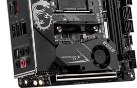 MSI MPG B550I Gaming Edge WiFi — очень маленькая материнская плата на среднебюджетном чипсете, отнесенная к промежуточной серии MPG. Функциональность для платы форм-фактора Mini-ITX очень хороша: 11 портов USB разных видов (правда, USB 3.2 Gen2 всего два), 1 слот PCIe х16 (с 16 линиями от процессора), 2 слота M.2, 4 порта SATA. Система питания способна обеспечить работу любых совместимых процессоров даже в турборежиме (однако для этого потребуется хороший кулер). Плата имеет мало разъемов для подключения вентиляторов и помп, это типично для решений ее формата. Отлично дополняют картину два сетевых контроллера: быстрый беспроводной Wi-Fi 6 и 2,5-гигабитный проводной. Имеются и недостатки разводки, главный из которых — совмещение чипсета В550 и слота M.2_1, накопитель в котором подогревается чипсетом и в свою очередь греет чипсет. Впрочем, над ними есть радиатор с вентилятором.