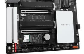 Gigabyte B550 Vision D — материнская плата на среднебюджетном чипсете. Ее средняя цена на момент подготовки обзора — в районе 20 тысяч рублей. Плата серьезная и стильная черно-белая. Функциональность у нее отличная: 16 портов USB разных видов (включая 4 USB 3.2), 2 высокоскоростных порта Thunderbolt3, 4 порта SATA, два проводных гигабитных сетевых контроллера и беспроводной Wi-Fi 802.11ac + Bluetooth 5.0, два слота M.2 (один из них подключен к процессору), плюс два слота PCIe x16 для видеокарт, также поддерживающие PCIe 4.0. Система питания способна обеспечить работу любых совместимых процессоров в турборежиме. Плата имеет 8 разъемов для подключения вентиляторов и помп, радиаторами оснащены все накопители в слотах M.2.
