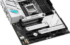 Материнская плата Asus ROG Strix B650-A Gaming WiFi представляет собой игровое решение из дорогой линейки компании c ценником в районе 30 тысяч рублей. У нее 16 портов USB, включая 1 USB 3.2 Gen2×2 и 5 USB 3.2 Gen2, 2 слота PCIe х16 (один подключен к процессору 16 линиями PCIe 4.0), 2 слота PCIe x1, 3 слота M.2 (два подключены напрямую к процессору), 4 порта SATA и 7 разъемов для вентиляторов. Также есть два сетевых контроллера: проводной 2,5-гигабитный и беспроводной Wi-Fi 6. Плата имеет неплохую систему охлаждения почти каждого потенциально греющегося элемента, включая накопители в слотах M.2. В числе плюсов можно упомянуть широкие возможности для подключения дополнительных RGB-устройств и симпатичную подсветку на кожухе задних портов.