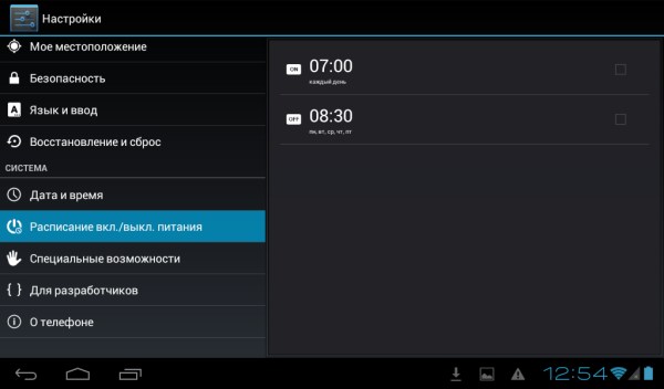 Набор софта стандартен. Список дополнительных функций включает звонки, SMS/MMS, а также автоматическое отключение: