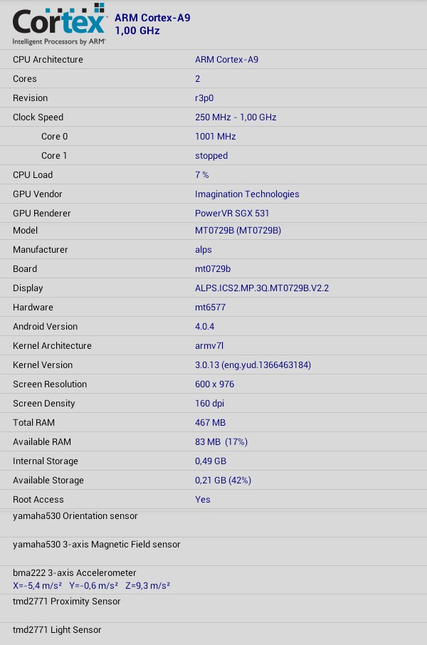 - Центральный процессор: 2 ядра ARM Cortex-A9 @1ГГц (микроархитектура ARMv7)