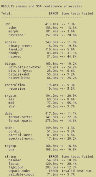 | Mozilla Kraken (штатный браузер, меньше — лучше) | 46397,7 мc | 45380 мс | 19189,5 мс |