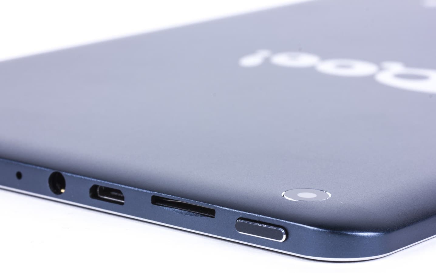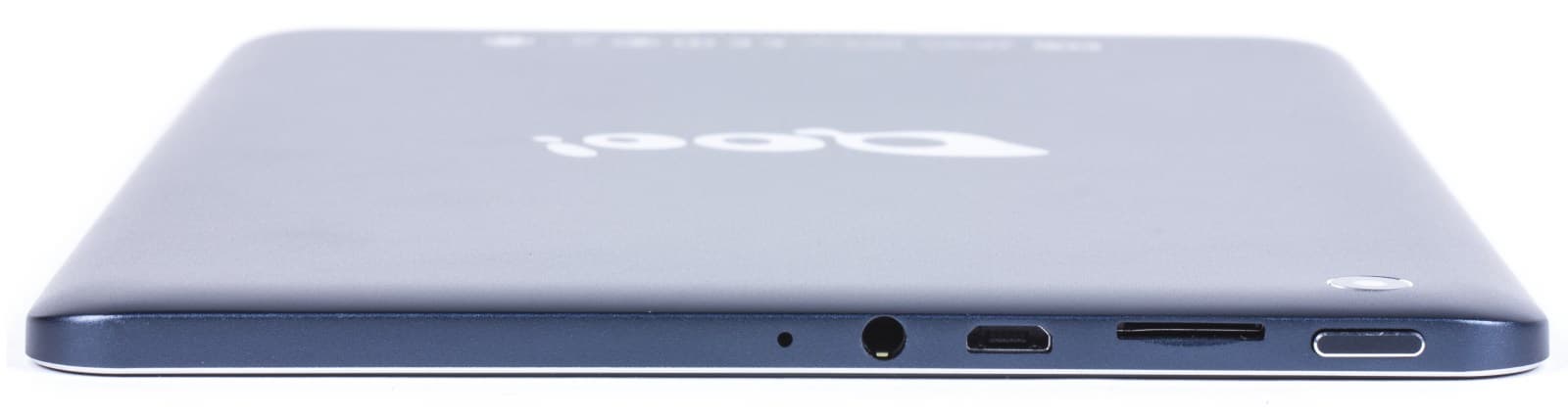 С расчетом на постоянное ношение в обложке все функциональные элементы планшета тесно сгруппированы на верхней грани. Слева, судя по всему, расположено отверстие микрофона — по крайней мере, других кандидатур на эту позицию не предусмотрено. Далее мы видим едва умещающееся здесь гнездо для наушников, разъем Micro-USB и подпружиненный слот microSD. Завершает все единственная механическая кнопка планшета, отвечающая за выключение и блокировку. Она, как и корпус планшета, имеет полированную рамку — такие мелочи также добавляют устройству солидности.