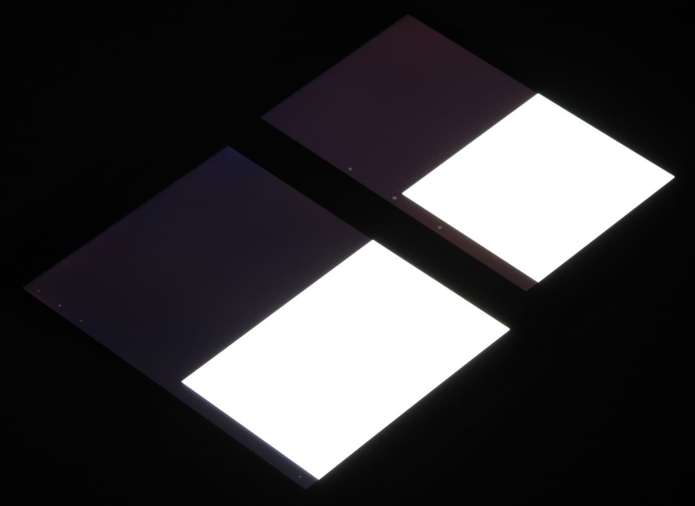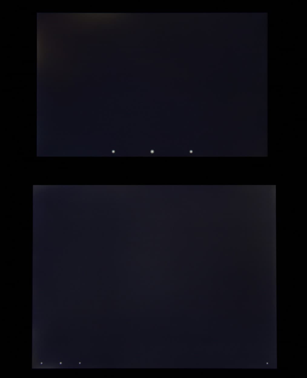 При перпендикулярном взгляде равномерность черного поля средняя, так как по краю есть несколько участков с немного повышенной яркостью черного и по полю есть некоторая пятнистость: