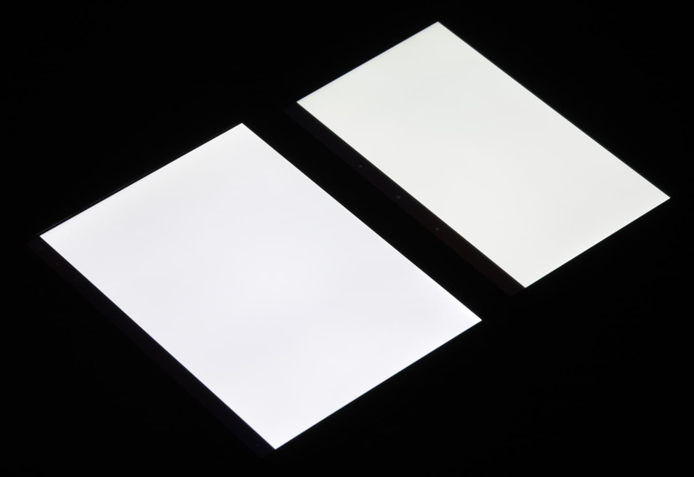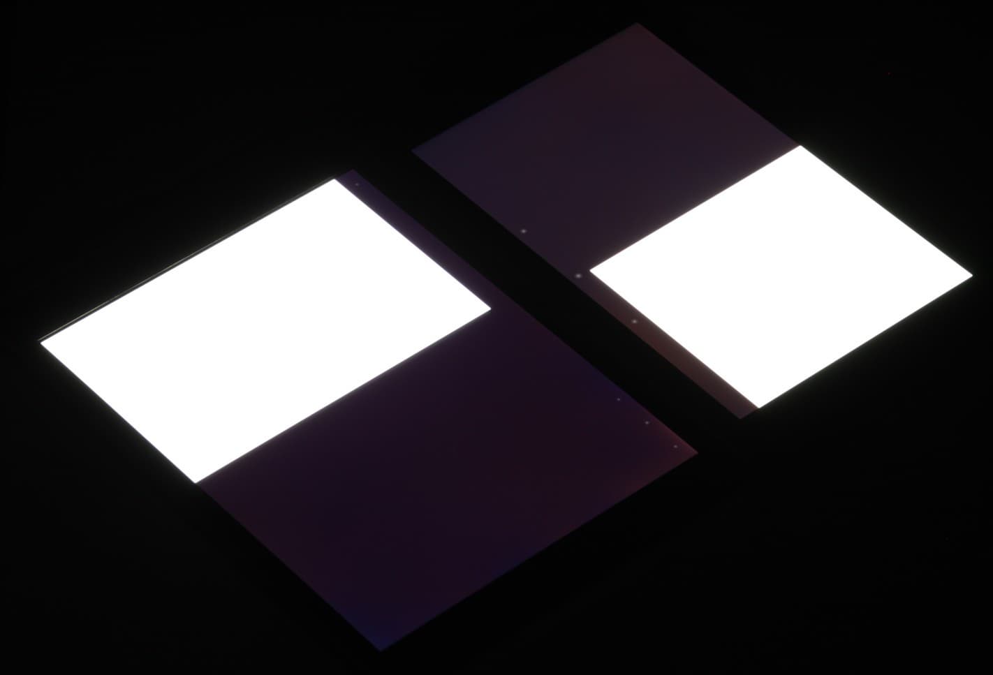 Яркость под углом у обоих планшетов заметно уменьшилась (как минимум в 5 раз, исходя из разницы в выдержке), но в случае 3Q падение яркости чуть-чуть меньше (средняя яркость по фотографиям 238 против 235 у Nexus 7). При этом цветовой тон изменился несильно. Черное поле при отклонении по диагонали высветляется слабо и приобретает красно-фиолетовый оттенок. Фотография с Nexus 7 для сравнения это показывает (яркость белых участков в перпендикулярном направлении у обоих планшетов одинаковая):