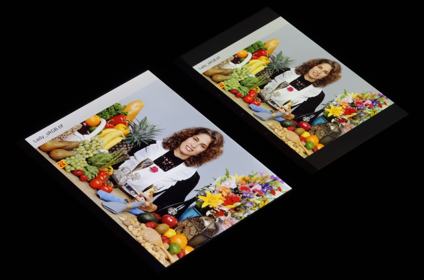Данный прием позволяет увеличить яркость экрана при тех же затратах энергии на подсветку. В итоге цвета изображений — рисунков, фотографий и фильмов, — ориентированных на пространство sRGB (а таких подавляющее большинство), имеют слегка уменьшенную насыщенность. Баланс оттенков на шкале серого хороший, так как цветовая температура пусть и выше стандартных 6500 К, но отклонение от спектра абсолютно черного тела (ΔE) меньше 3, что для потребительского устройства считается отличным показателем. При этом цветовая температура и ΔE мало изменяются от оттенка к оттенку, что хорошо сказывается на визуальной оценке цветового баланса. (Темные области шкалы серого можно не учитывать, так как там баланс цветов не имеет большого значения, да и погрешность измерений цветовых характеристик на низкой яркости большая.)