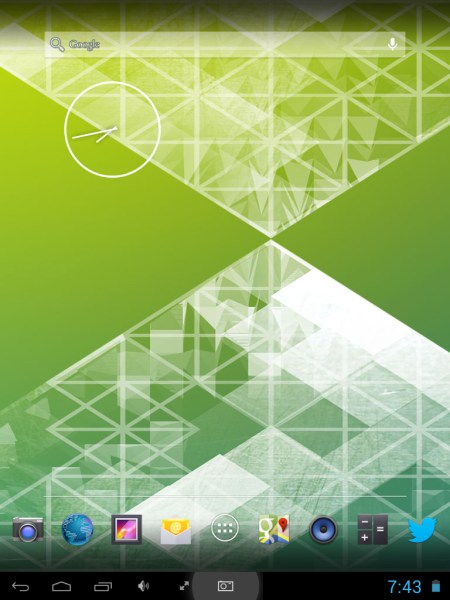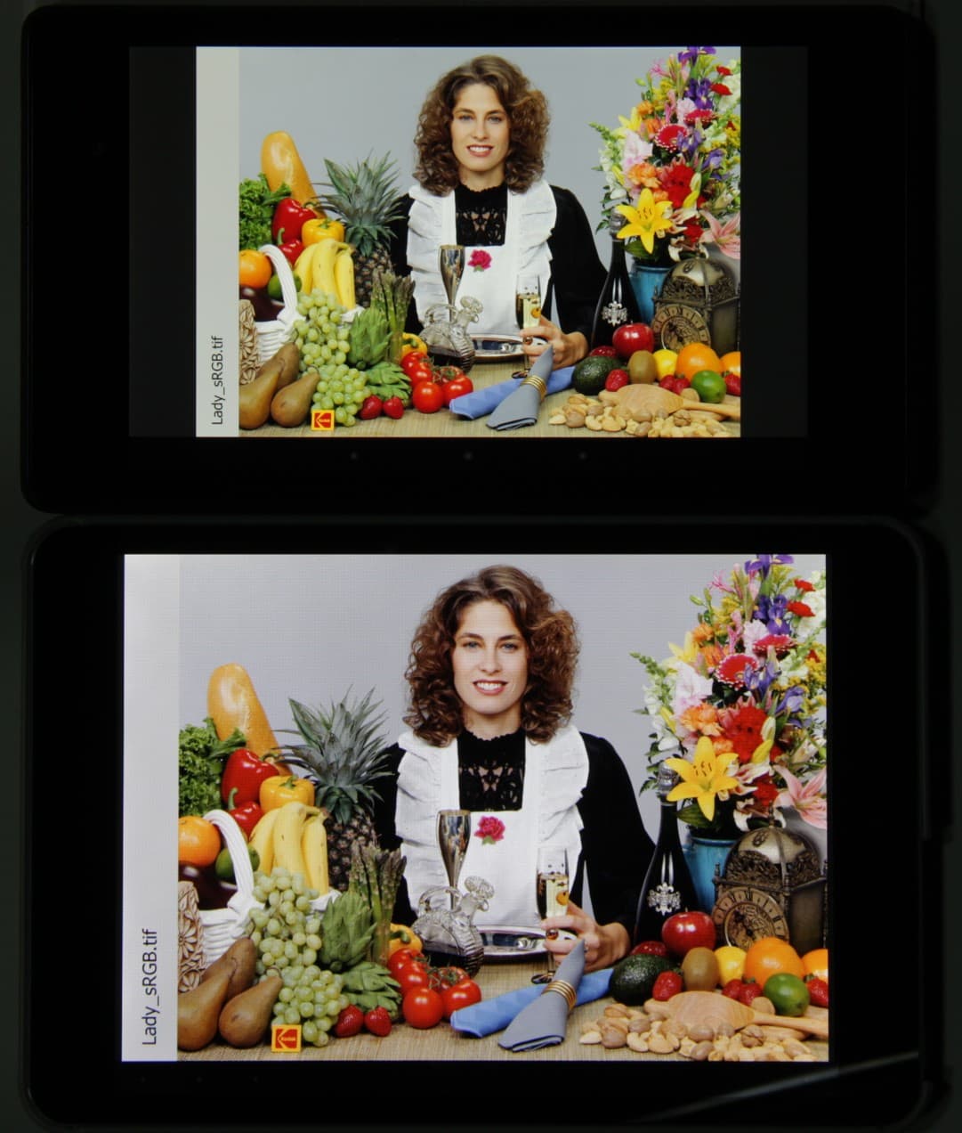 Экран имеет хорошие углы обзора без инвертирования оттенков и без значительного сдвига цветов даже при больших отклонениях взгляда от перпендикуляра к экрану. Для сравнения приведем фотографии, на которых на экраны Nexus 7 и тестируемого планшета выведены одинаковые изображения, при этом яркость обоих экранов установлена примерно на 200 кд/м². Перпендикулярно к экранам тестовая картинка: