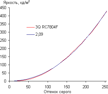 Контрастность (примерно в центре экрана) нормальная — порядка 800:1. Построенная по 32 точкам гамма-кривая не выявила завала ни в светах, ни в тенях, а показатель аппроксимирующей степенной функции равен 2,09, что немного ниже стандартного значения в 2,2, то есть изображения на этом экране буду выглядеть чуть-чуть светлее, при этом реальная гамма-кривая несколько отклоняется от степенной зависимости: