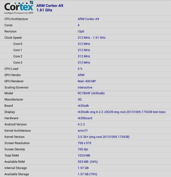 Работу 3Q RC7804F обеспечивает популярная однокристальная система Rockchip RK3188. Подробней с ее характеристиками можно ознакомиться в обзоре Cube U30GT2. Объем оперативной памяти планшета составляет 1 ГБ. В отличие от дизайна, в аппаратной части ничего особенного нет.