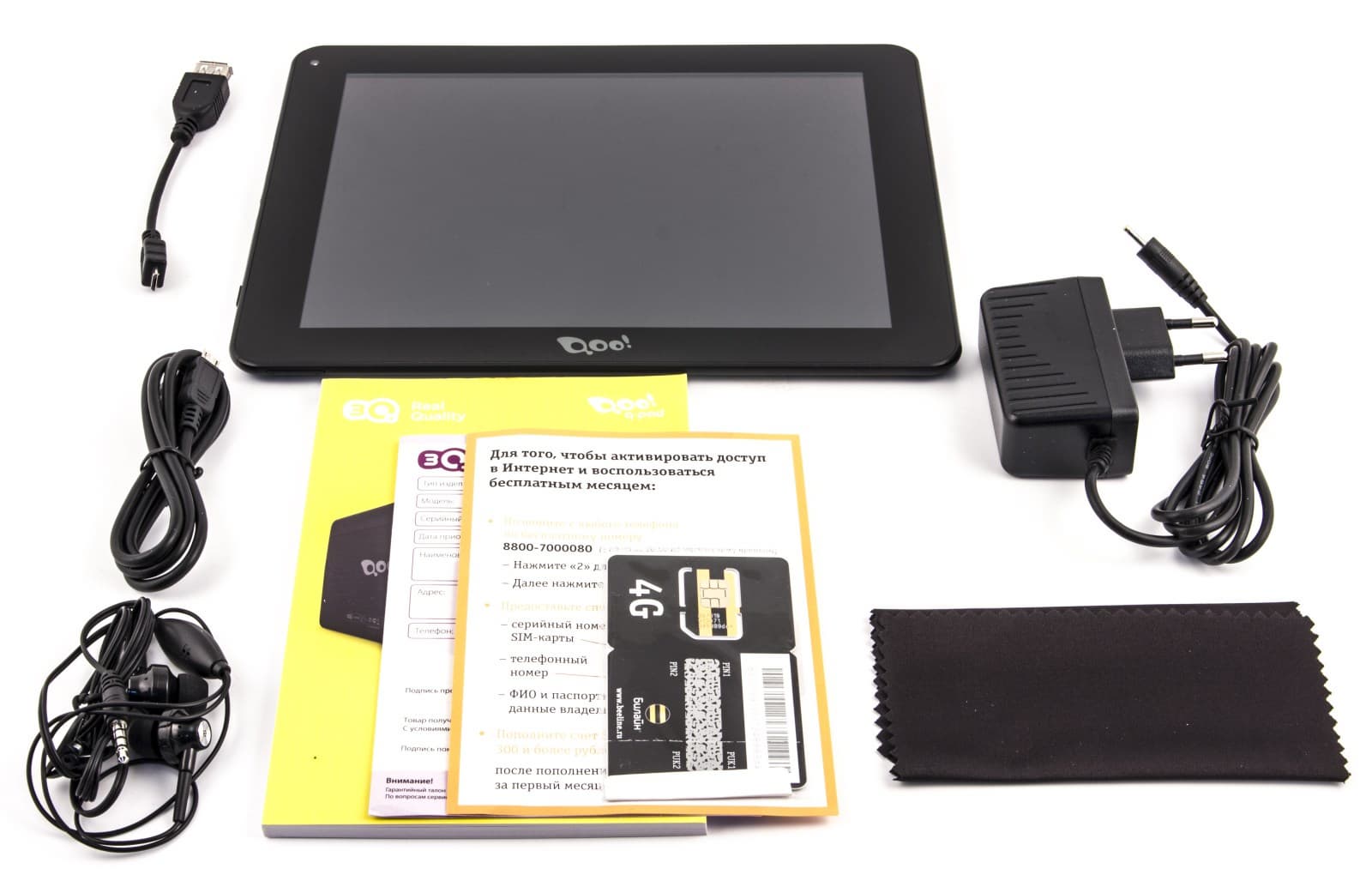 Помимо стандартного трио из зарядного устройства, кабелей USB и OTG, в комплект поставки входит толстая инструкция, гарантийный талон, стандартная гарнитура, тряпочка для протирки дисплея и SIM-карта Билайн.