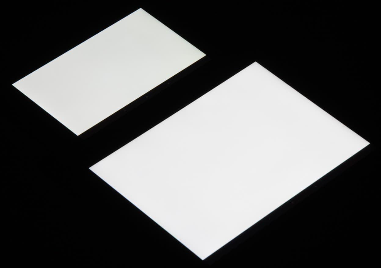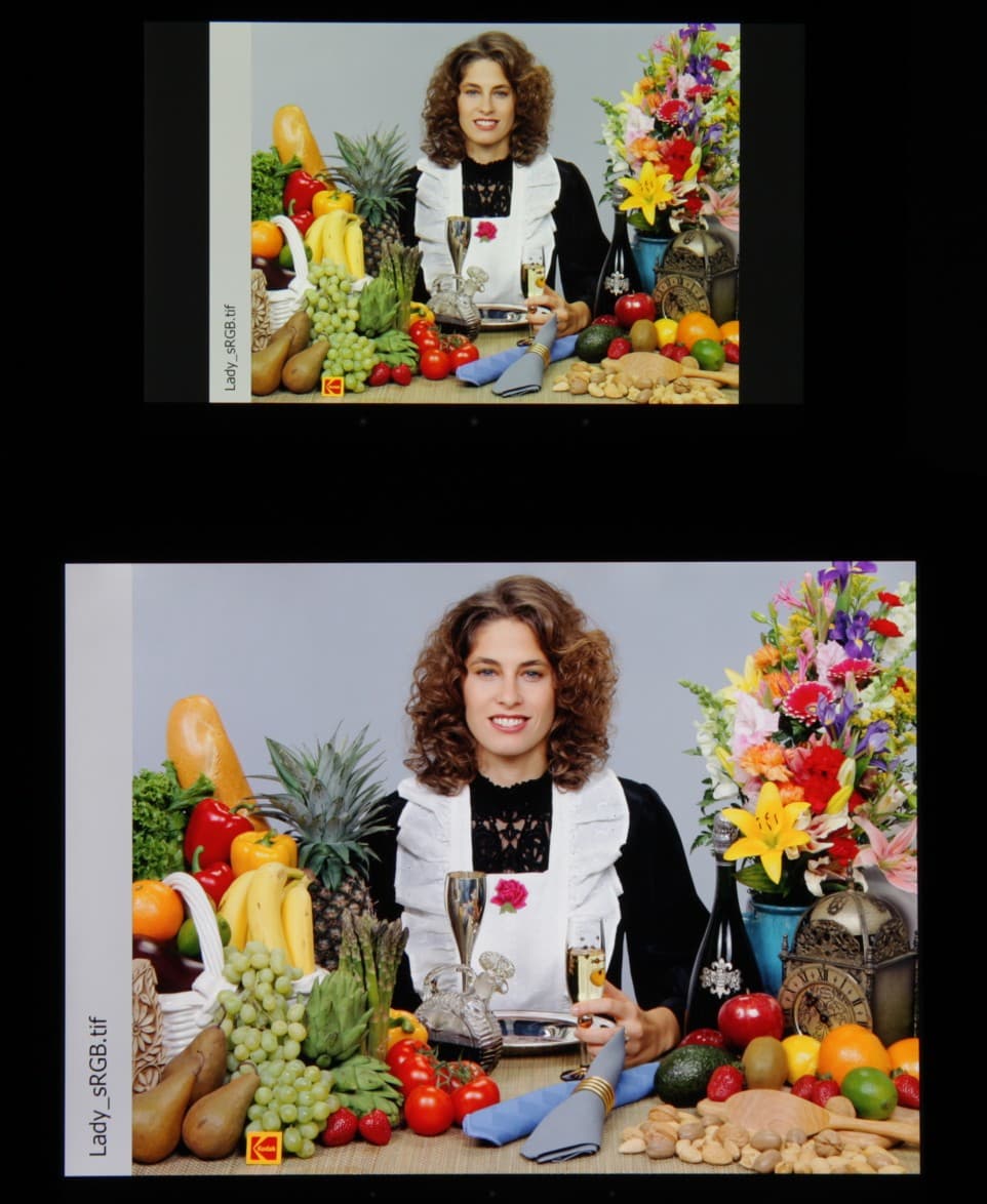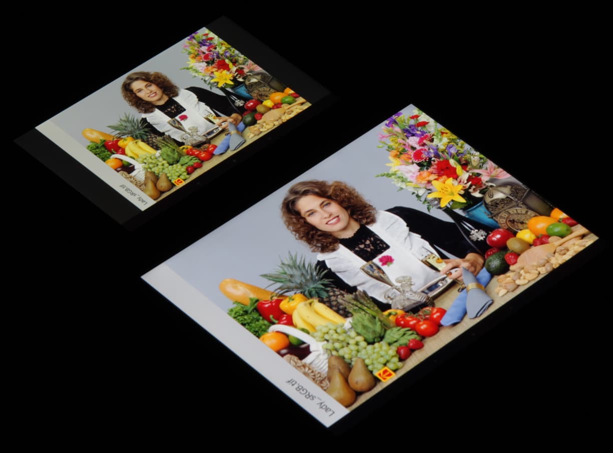 Видно, что цветопередача немного различается, но это единственный обоснованный вывод, который можно сделать по фотографии. И белое поле: