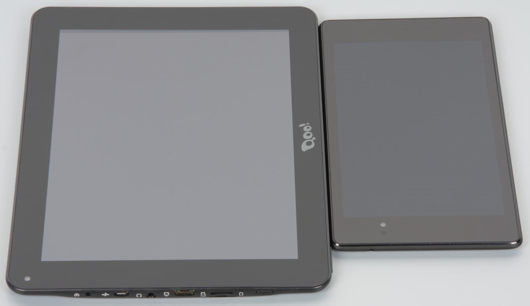 Лицевая поверхность экрана выполнена в виде стеклянной пластины с зеркально-гладкой поверхностью, устойчивой к появлению царапин. Судя по отражению объектов, возможно, есть какой-то антибликовый фильтр, который по снижению яркости отражения заметно хуже, чем у Google Nexus 7 (2013) (далее мы сравниваем именно с ним). Для наглядности приведем фотографии, на которых в выключенных экранах обоих планшетов отражается белая поверхность (3Q Q-pad RC9727F — слева, далее их можно различать по размеру):
