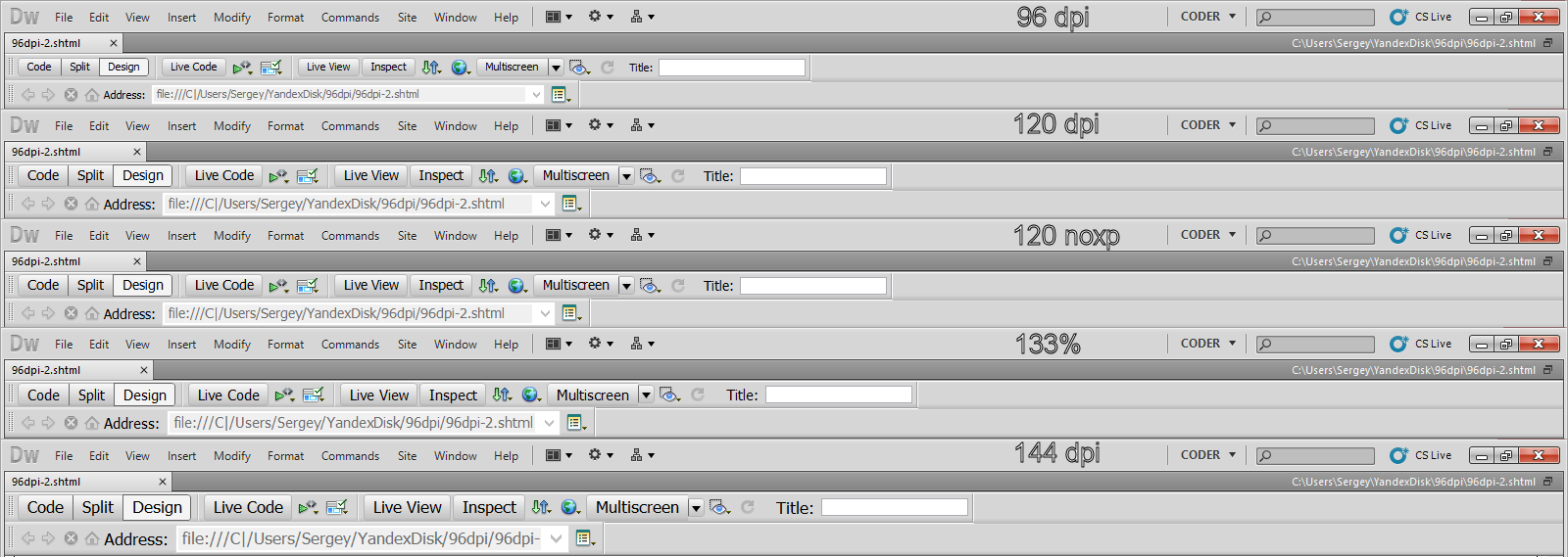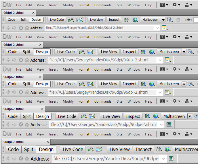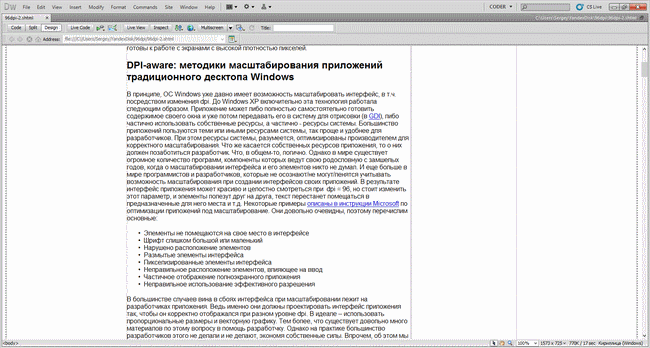 Приложение, судя по всему, сообщает системе о том, что готово к масштабированию, но на практике масштабирование работает неправильно: не все элементы интерфейса корректно увеличиваются при изменении системной настройки. Увеличение масштаба элементов в рабочих окнах в соответствии с системными настройками — палка о двух концах, т. к. читаемость увеличивается, но нарушается раскладка страницы. При этом собственные алгоритмы масштабирования в Dreamweaver неработоспособны из-за некорректного масштабирования шрифтов. Собственно, именно в результате этих ошибок и недоработок разработчиков некорректно обрабатываются страницы с фиксированным размером элементов.