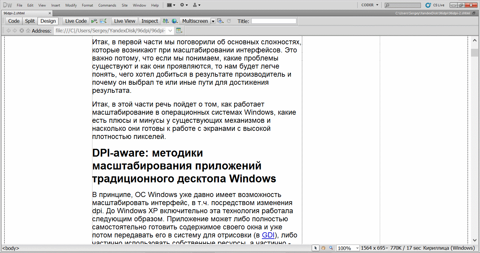 Можно долго спорить, кто тут виноват, идеология или приложение, но результат один: мы получаем более крупные шрифты в узкой колонке, слова перестают умещаться в ячейках таблицы, в строку влезает меньше слов… При этом на мониторах с высоким PPI работать все равно неудобно: хотя шрифты стали крупнее, колонка стала слишком узкой, чтобы можно было адекватно работать (вот gif со сравнением текста в колонке при 96 и 144 dpi), к тому же вы не сможете понять, как в результате будет выглядеть страница в браузере. В теории эта проблема может решаться через указание пропорциональных величин, но тогда возникнут другие проблемы (мы о них поговорим в разделе о браузерах).