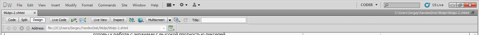 Другими словами, Dreamweaver не умеет корректно масштабировать шрифты внутри приложения (либо использует растровые шрифты, что тоже…). Причем система-то этот же шрифт масштабирует нормально. В результате при работе над страницей вам нельзя менять системные настройки (иначе поедет разметка на странице), а поставить другой масштаб внутри приложения вы не можете из-за ужасающего качества шрифтов. Кстати, примерно такая же проблема со шрифтами была у MS Office для Mac (это стало заметно после появления экранов Retina), но сейчас она вроде бы уже исправлена.