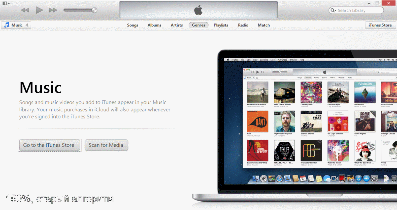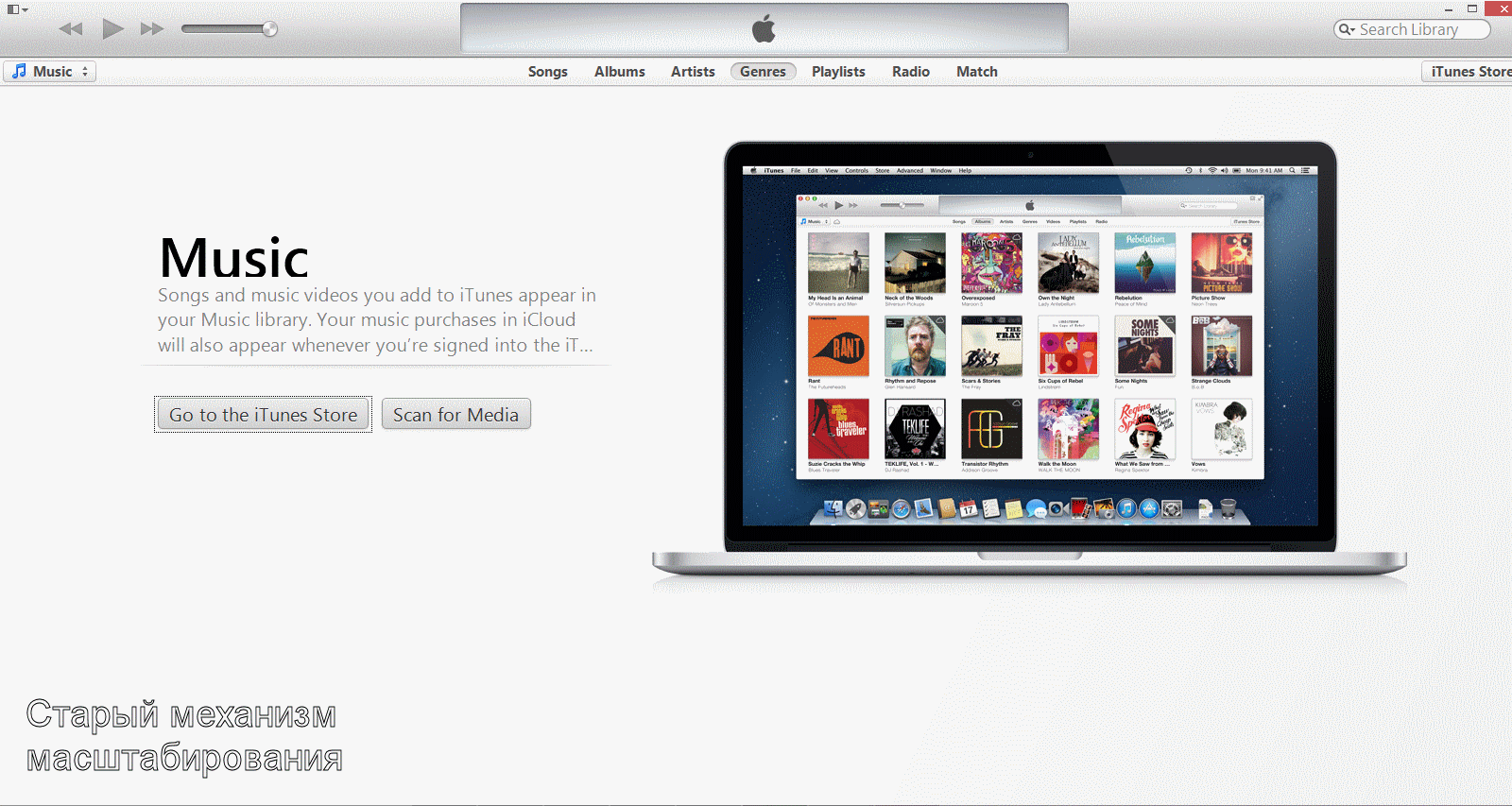У iTunes действительно есть проблемы с масштабированием. В базовом разрешении 96 dpi все выглядит отлично. На 120 dpi все вроде бы еще хорошо, но если обратить внимание, низ слова Music срезан. Это как раз тот пограничный случай между старым и новым механизмами масштабирования, когда нарушения разметки уже есть, но еще не критичны. В этом случае стараются использовать старый механизм, вполне резонно полагая, что лучше пусть немного нарушится разметка, чем станут расплывчатыми все шрифты.