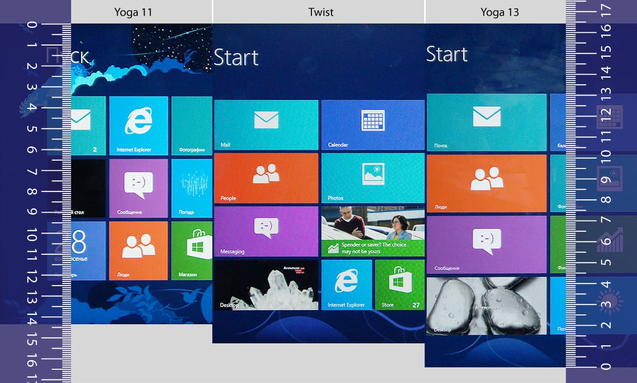На главном экране системы в Yoga 11 (1366×768, 11,6 дюйма) помещается всего три вертикальных ряда плиток, а в Twist (1366×768, 12,5 дюйма) и Yoga 13 (1600×900 при 13,3 дюйма) — четыре. Размер плиток по горизонтали неважен, т. к. в этом направлении меню прокручивается, т. е. элементы могут быть любого размера.