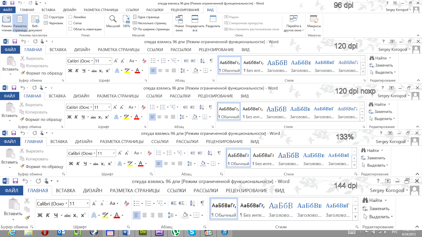 - Microsoft Word 2013 — если какое-то приложение и будет масштабироваться абсолютно правильно, то наверняка оно относится к системе Windows или к пакету Office. Так что Word мы взяли как образец.