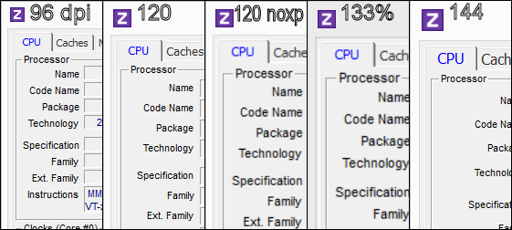 Итак, вот перед нами классический образец приложения, написанного под 96 dpi и не имеющего отметки о поддержке масштабирования. При переходе с 96 на 120 dpi размер окна приложения увеличивается, соответственно увеличиваются и все выделенные окна для текста внутри основного окна, однако жестко прописанные шрифты остаются того же размера, просто промежутки между ними стали больше. При этом заголовок окна (где написано CPU-Z) — четкий, видимо, его отрисовкой занимается система. Ошибок в интерфейсе пока не появилось, приложение вполне сохраняет читаемость.