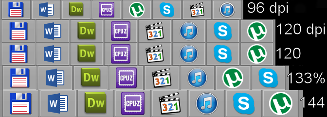 Интересная ситуация сложилась с иконкой приложения iTunes. Во время первого замера при увеличении dpi иконка в таскбаре показывалась с искажениями, хотя на десктопе все было нормально. Во время второго замера иконка корректно отображалась и там, и там.