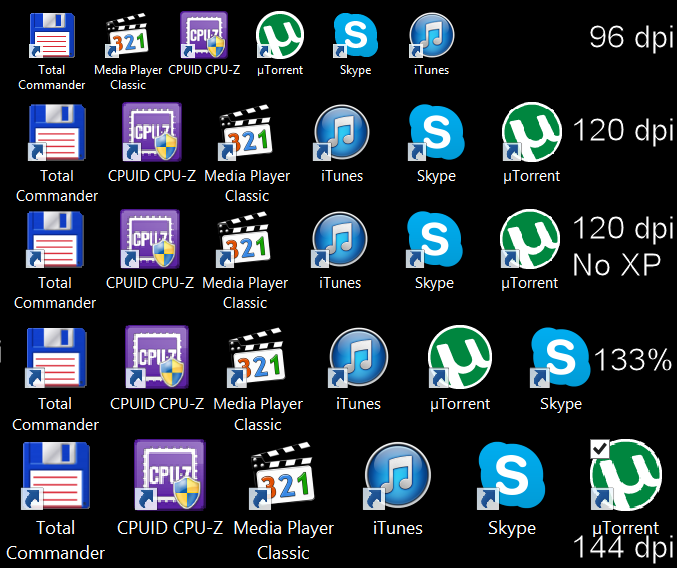 Итак, при 120 dpi иконка uTorrent теряет плавность линий, в окружности появляются надломы. В таскбаре за счет меньшего масштаба искажений нет. Также испортилась иконка CPU-Z: при масштабировании надпись на ней стала неприятно пикселизированной. Остальные иконки смотрятся хорошо. Отключение механизма ХР не принесло изменений, а при увеличении масштаба ситуация с иконками даже улучшилась. Что интересно, иконка uTorrent при масштабе 133% выглядит гораздо приятнее, чем при масштабе 150%.