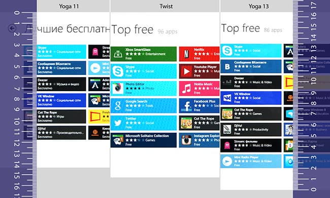 Помимо того, мы оценили масштабирование в магазине приложений Windows Store — точнее, на экране со списком приложений. Результат оказался несколько неожиданным: у Yoga 11 и Twist список приложений выводится на 6 строках, а у Yoga 13 — на восьми.