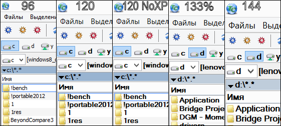 При переходе на 120 dpi абсолютно все шрифты увеличились, а вот графические элементы остались первоначального размера (включая иконки папок). Отключение старого механизма не приводит ни к какому результату, значит, это приложение промаркировано как dpi-aware и должно масштабироваться корректно.