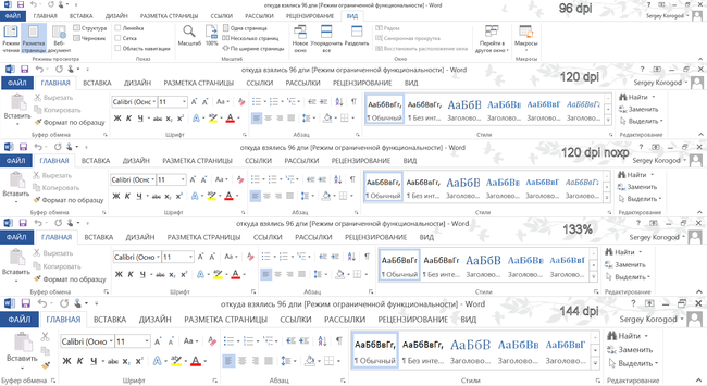 В целом, Word 2013 (думаю, как и любые другие приложения MS Office) при любом масштабе и dpi обеспечивает настолько гладкую картинку, насколько это возможно. Такое чувство, что даже графика фона векторная, настолько все хорошо. Новый Word выглядит фантастически гладко и даже как-то стерильно.