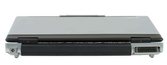 Задняя грань почти полностью занята батареей. Тем не менее, с одного бока от нее находится разъем штекера питания (очень удобно ищется на ощупь), с другой — разъем докстанции. При работе без лишней подключенной периферии рядом с ноутбуком нет проводов, что является плюсом.
