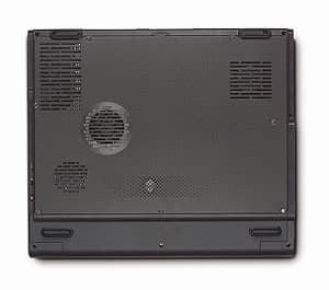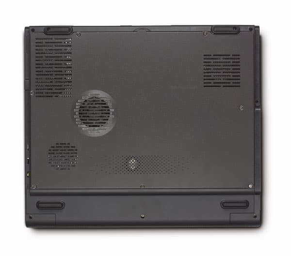 Снизу в передней части ноутбука — аккумуляторная батарея, все остальное пространство днища занимает крышка с вентиляционными отверстиями и решеткой низкочастотного динамика.