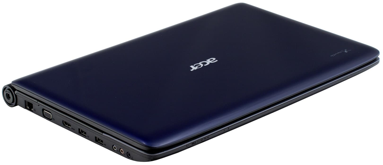 Несмотря на полноразмерные габариты для ноутбуков такого класса, выглядит Aspire 7535 достаточно элегантно благодаря темно-синей глянцевой крышке и плавным очертаниям корпуса. Вес 3,25 кг вполне соответствует категории ноутбуков с 17-дюймовым экраном, в данном случае еще и оснащенного достаточно мощной 6-ячеечной батареей, так что вероятно ноутбук окажется способным существовать и какое-то время без подпитки из розетки. Крышка не имеет защелки, но открывается туго, и будет сохраняться в закрытом положении, даже если вы будет носить его с собой в обычной сумке в незафиксированном состоянии. Что, вообще говоря, не рекомендуется в случае с любым ноутбуком. А в данном случае, вдвойне маловероятно, поскольку если уж задуматься над вопросом длительного пешего движения с ноутбуками такого класса, логичнее всего приобрести специальный рюкзак. В котором и само устройство не будет болтаться, и вес будет равномерно распределен, так что не испортит осанку, а даже в некоторой степени поспособствует ее улучшению.