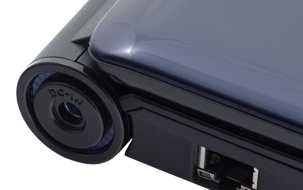 Возможно кому-то покажется грубоватой такая конструкция петель, вращающихся заодно с крышкой, но с другой стороны это тоже элемент оригинального дизайна. Причем место на самих петлях задействуется с пользой: на одной стороне находится разъем внешнего питания, а в правую петлю встроен порт «противоугонного» замка. Жалко лишь, что крышка при открывании перекрывает доступ к задней панели, поэтому остальные разъемы пришлось распределить по трем свободным сторонам (вернее, конечно же, по двум, поскольку переднюю стенку конструкторы уже давно стараются задействовать по минимуму, что очень даже правильно).