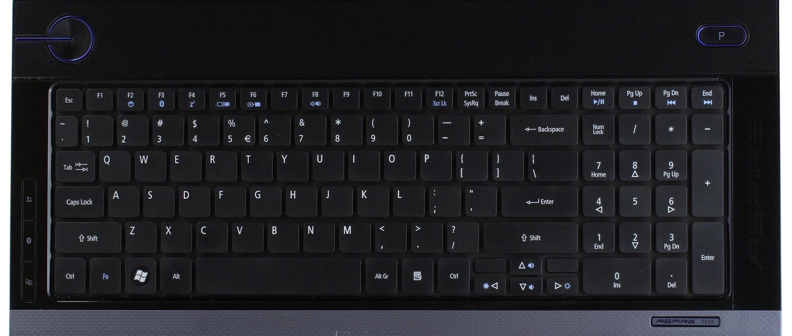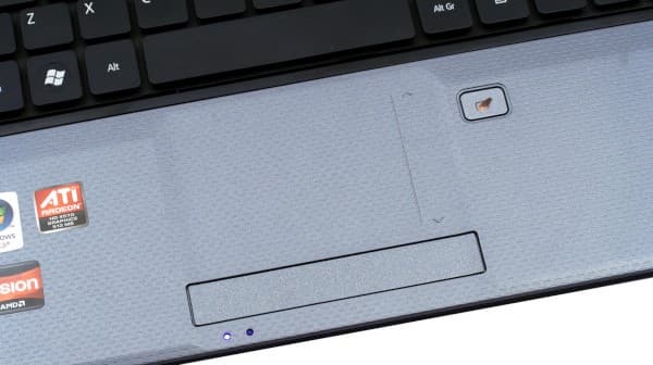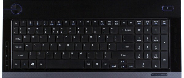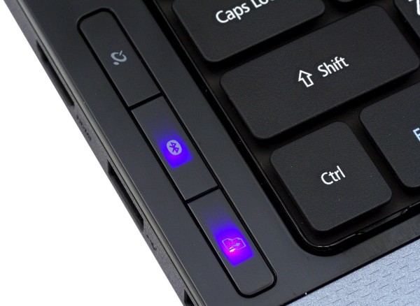 Индикаторы светят не ярко, и хотя преимущественно используются светодиоды синего цвета, выглядит подсветка не агрессивно, в том числе и оригинально подсвеченная кнопка питания. Часть индикаторов встроены в переднюю стенку, остальные встроены в рамку клавиатуры, а точнее в сами кнопки, включающие беспроводную сеть и Bluetooth-адаптер. Не стали инженеры Acer баловать пользователей дополнительными клавишами для быстрого вызова приложений и т.п., есть лишь большая кнопка над клавиатурой на правой части корпуса, вызывающая фирменный заменитель панели задач, остальные команды закреплены за верхним рядом функциональных клавиш и доступны при одновременном нажатии с клавишей Fn.