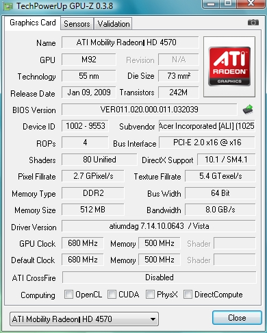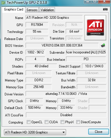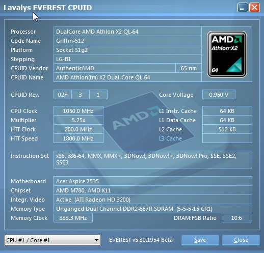 Но совершенно очевидно, что если для настольной платформы такое решение является опциональным и более естественным выглядит развитие дискретных видеокарт с учетом максимально эффективного снижения потребляемой ими энергии в простое. То в ноутбуке каждый «ватт» на счету, поэтому наличие «облегченного» второго видеоядра в обозримом будущем останется популярным решением, а точнее будет использоваться гораздо шире. Мы же рассмотрим не совсем типичный вариант такой конструкции от Acer, в котором использован не мобильный, а настольный чипсет AMD 780G в сочетании с мобильным видеоядром среднего уровня Radeon HD4570.