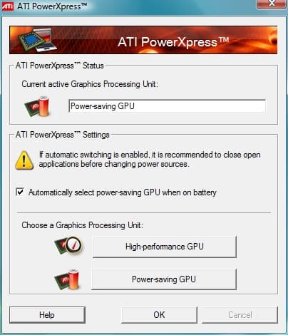 Мы тестировали в предустановленной системе (Windows Vista Home Premium 32-битной версии). Переключение с дискретного на интегрированное видеоядро по умолчанию происходит при отключении внешнего питания автоматически. Но пользователь может выбрать графический адаптер и вручную и, например, переходить на дискретное видео только непосредственно перед запуском игры. Для быстрого доступа к этому параметру, соответствующий пункт есть в меню, доступном через значок Catalyst Control Center в системном трее.