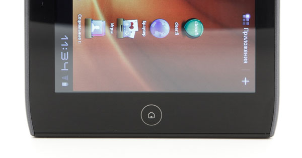 На передней панели есть сенсорная кнопка, обозначенная кружочком. Она выполняет функцию возвращения на домашний экран ОС («Домой»). Любопытно, что в 10-дюймовом Tab A500 этой кнопки не было. А здесь — есть, хотя в третьей версии Android необходимость в кнопках на самом устройстве отсутствует. И все же наличие этой кнопки — скорее плюс, чем минус. Хотя бы потому, что она расположена прямо под большим пальцем правой руки, если держать планшет горизонтально обеими руками.