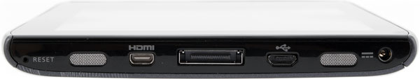 С разъемами ситуация, в целом, аналогична Iconia Tab A500 — за исключением разве что отсутствия USB. Итак, справа (или внизу, если повернуть устройство вертикально) мы видим док-разъем (без дополнительных аксессуаров бесполезный), Micro-USB и Micro-HDMI (также известный как HDMI типа D). Там же расположены два динамика и отверстие Reset.