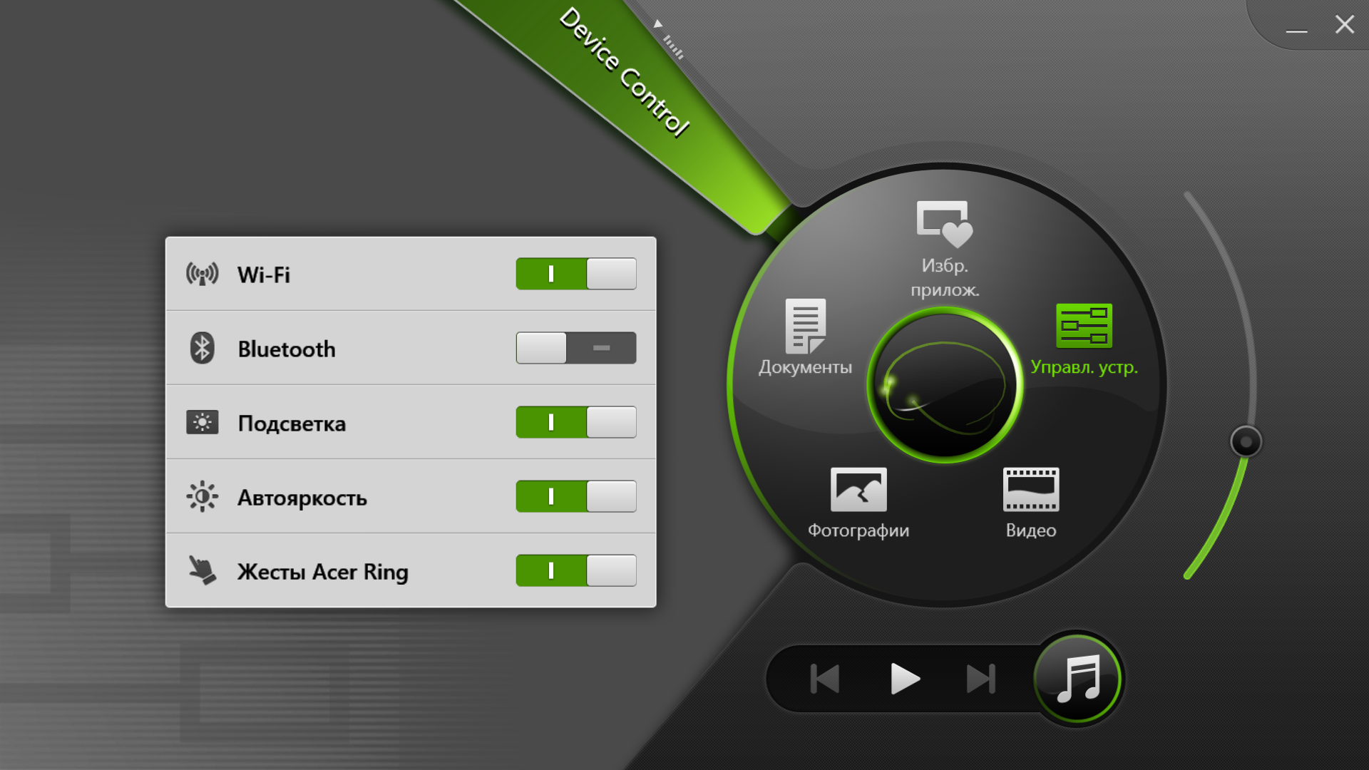 Базовая поставка устройства включает все необходимые драйвера Acer, Intel, Qualcomm, Realtek и других компаний. Установленное на устройстве дополнительное программное обеспечение состоит как из известных программ (Dolby Digital Theater, McAfee Internet Security Suite (подписка на 60 дней), Microsoft Office 2010 (может быть активирован в демо-режиме с ограниченным сроком действия или приобретенным лицензионным ключом)), так и некоторых фирменных утилит Acer. Среди последних отметим программу резервного копирования Acer Backup Manager, удобный для управления жестами комплект Acer Ring для настройки основных параметров системы и доступа к локальным файлам мультимедиа, AcerCloud и clear.fi для создания единой персональной «облачной» системы с доступом к файлам мультимедиа и офисным документам с любых совместимых устройств, а также, конечно, фирменный сервис Acer для обновления программ и драйверов.