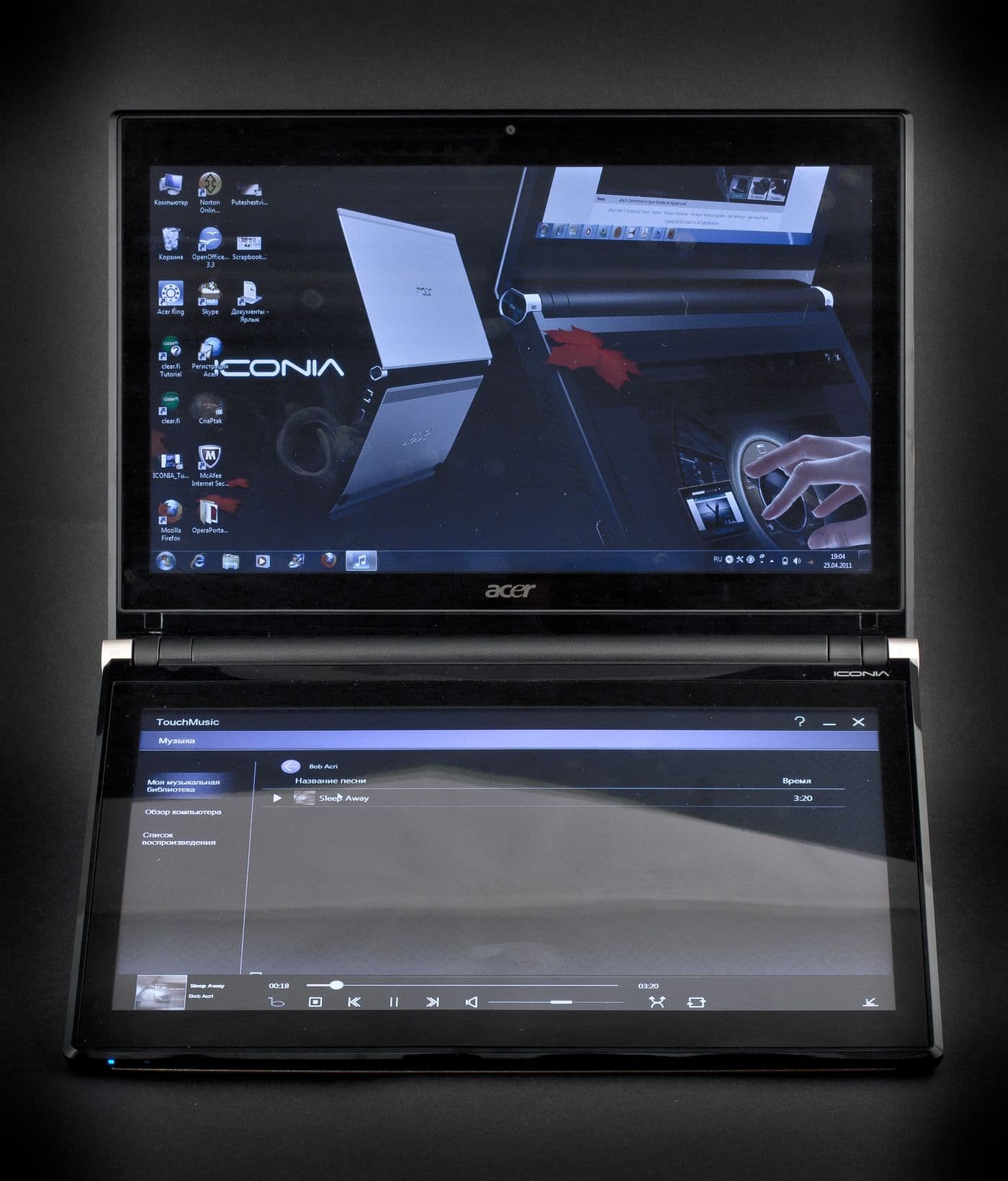 Однако самый большой сюрприз поджидает неподготовленного пользователя при открытии крышки: у Iconia напрочь отсутствует клавиатура, вместо нее расположен второй экран.