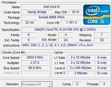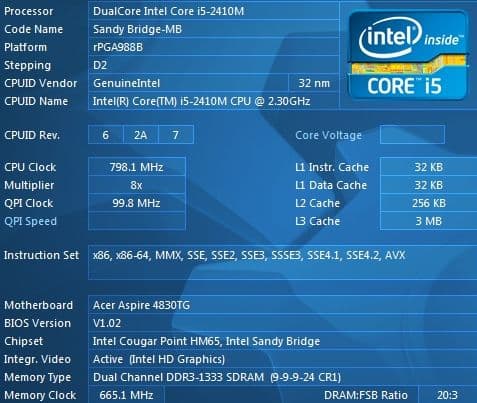 | Процессор | DualCore Intel Core i5-2410M, 2300 МГц (23×100) |
