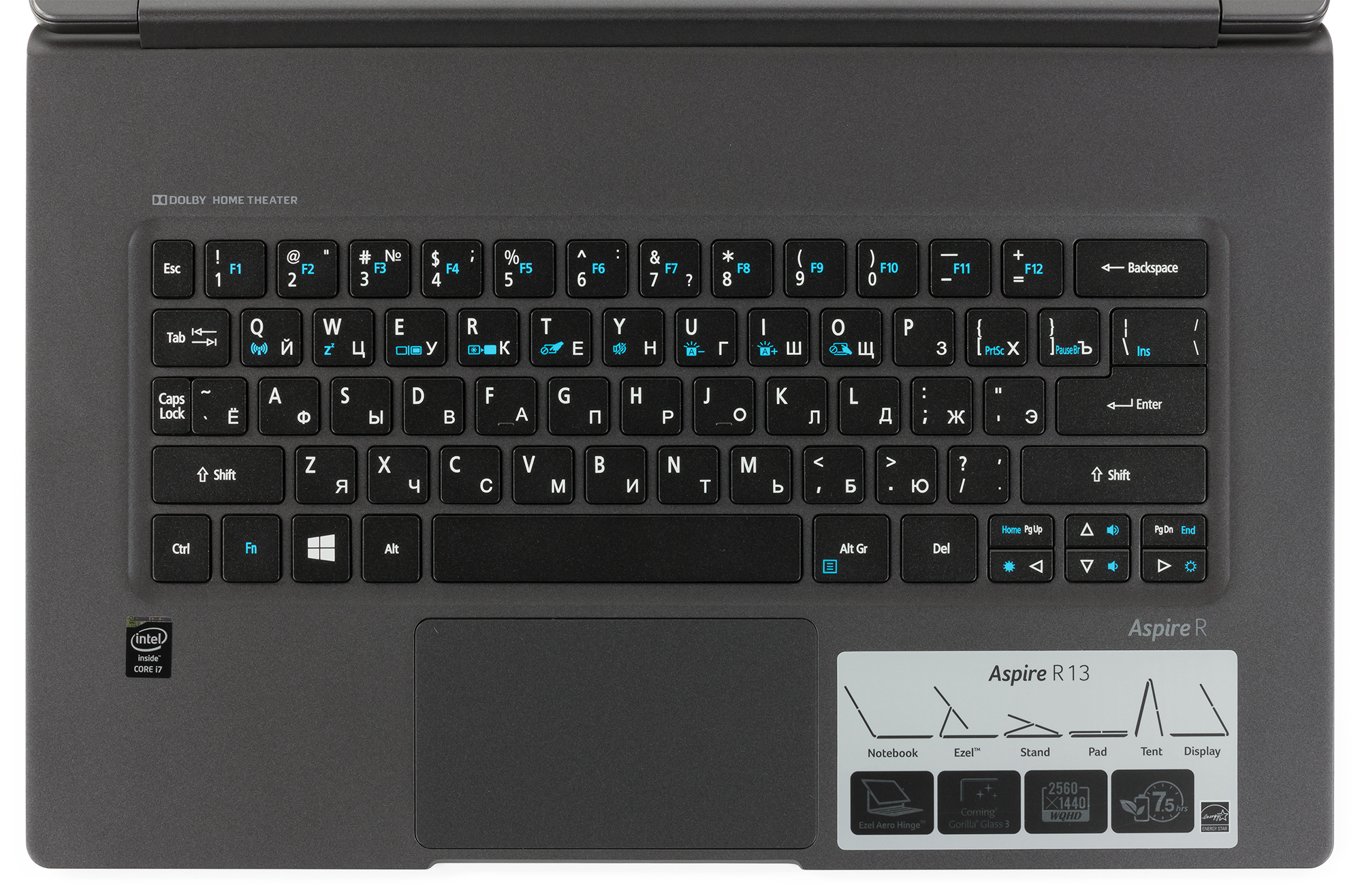 В ноутбуке Acer Aspire R7-371T используется уже ставшая традиционной для современных ноутбуков клавиатура островного типа с увеличенным расстоянием между клавишами. Основные клавиши имеют размер 15×15 мм, а величина зазора между клавишами составляет 3 мм. Клавиши пластиковые и имеют классический черный цвет, при этом буквы на клавиатуре (латинские и русские) белые и хорошо заметны на черном фоне клавиш. Поверхность под клавиатурой является единой с остальной поверхностью корпуса. Фактически, в этой поверхности просто проделаны отверстия под каждую клавишу клавиатуры.