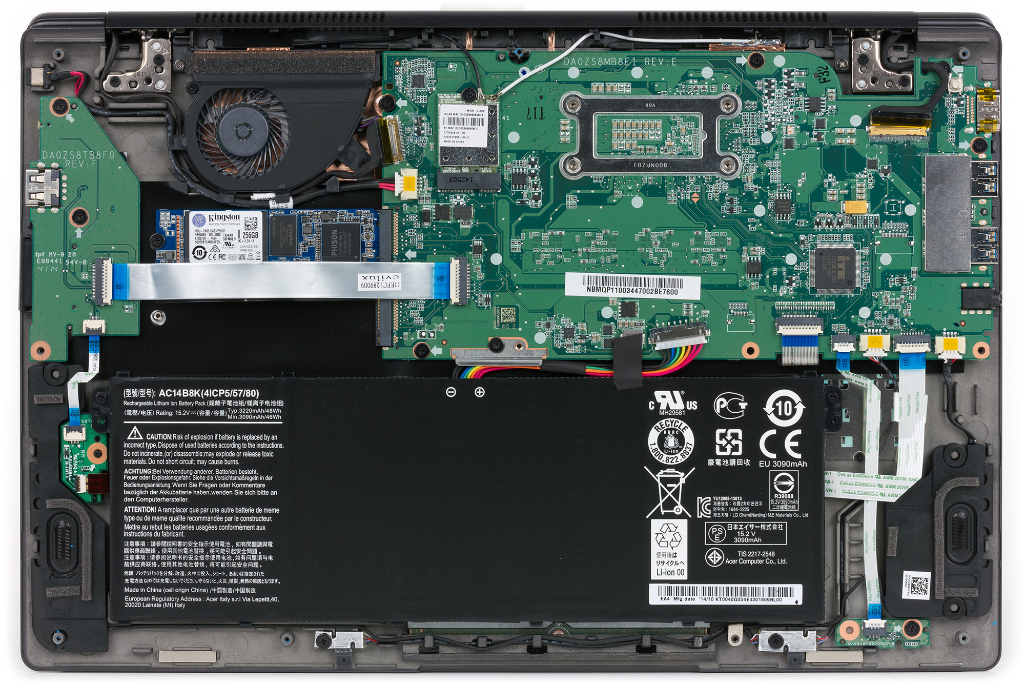 Подсистема хранения данных ноутбука Acer Aspire R7-371T представляет собой SSD-накопитель Kingston RBU-SNS8100S3/256GD емкостью 256 ГБ с разъемом M.2 (ключ M). В ноутбуке есть место для установки второго SSD-накопителя с разъемом M.2.