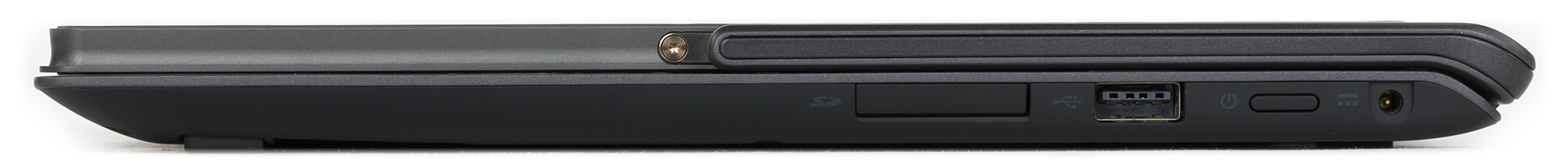 Поскольку трансформер Acer Aspire R7-371T допускает режим использования классического планшета, кнопка включения питания расположена на правом торце корпуса рядом с разъемом питания. На этом же торце имеется один порт USB 2.0 и слот для SD-карт памяти.