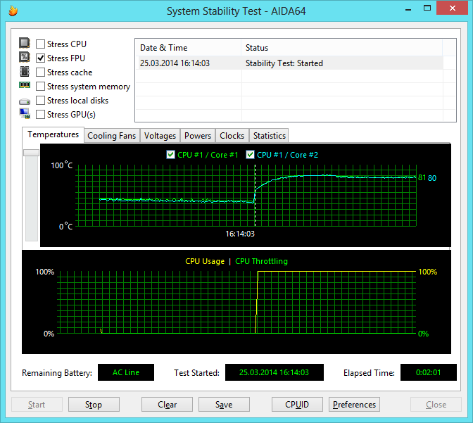 При нагрузке процессора тестом Stress FPU, который использует вычисления c плавающей точкой и в большей степени нагревает процессор, температура ядер процессора увеличивается до 82 °С. Частота ядер процессора в этом режиме составляет 2,1-2,2 ГГц.