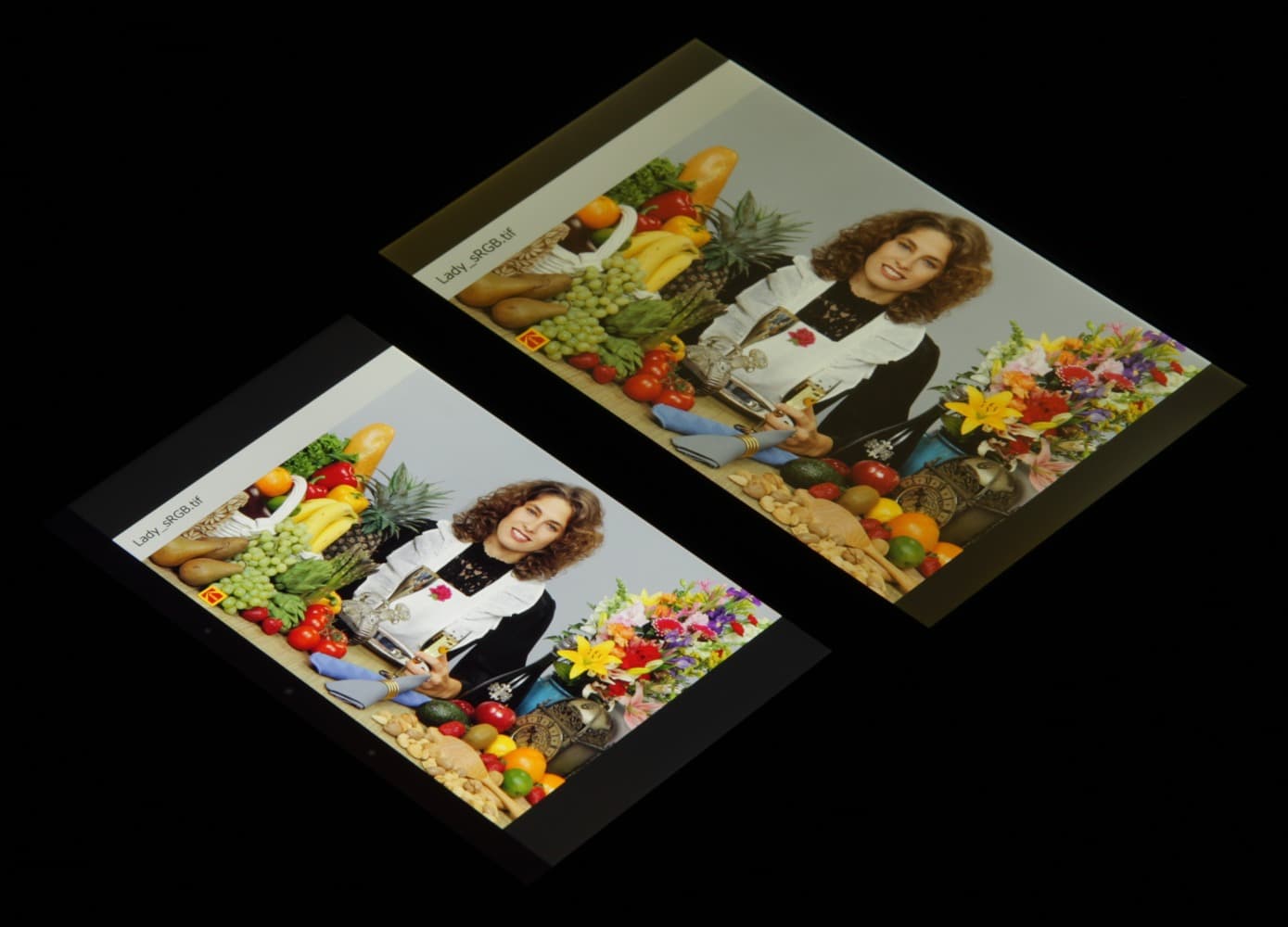 Экран имеет хорошие углы обзора без инвертирования оттенков и без значительного сдвига цветов даже при больших отклонениях взгляда от перпендикуляра к экрану. Для сравнения приведем фотографии, на которых на экраны Nexus 7 и тестируемого планшета выведены одинаковые изображения, при этом яркость обоих экранов установлена примерно на 200 кд/м², а цветовой баланс на фотоаппарате принудительно переключен на 6500 К. Перпендикулярно к экранам тестовая картинка: